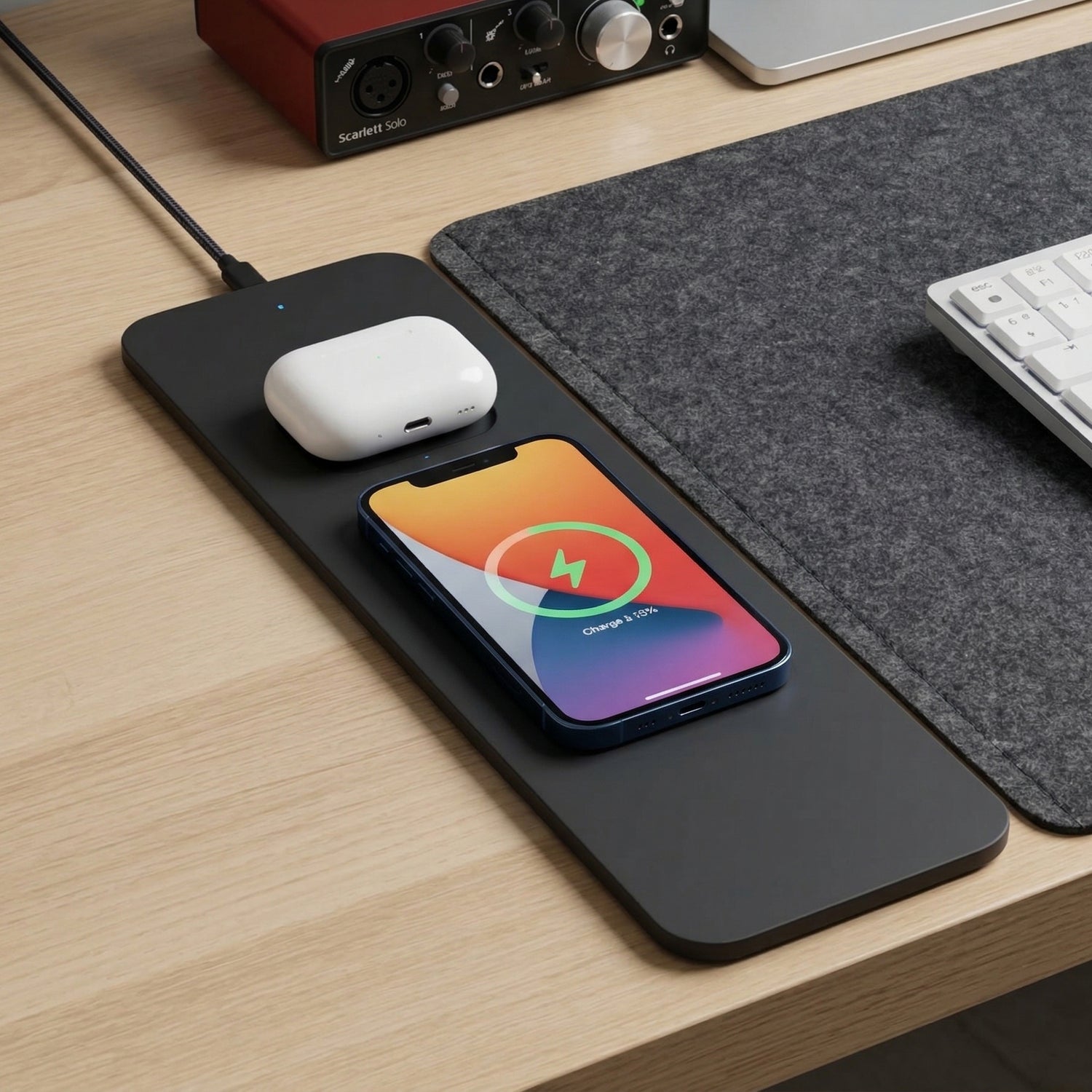 Libérez-vous des câbles qui encombrent votre vue. Le module magnétique 15W s'intègre naturellement à votre surface pour recharger vos appareils sans jamais rompre votre flux créatif. Posez. Chargez. Restez focus.