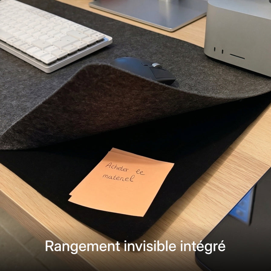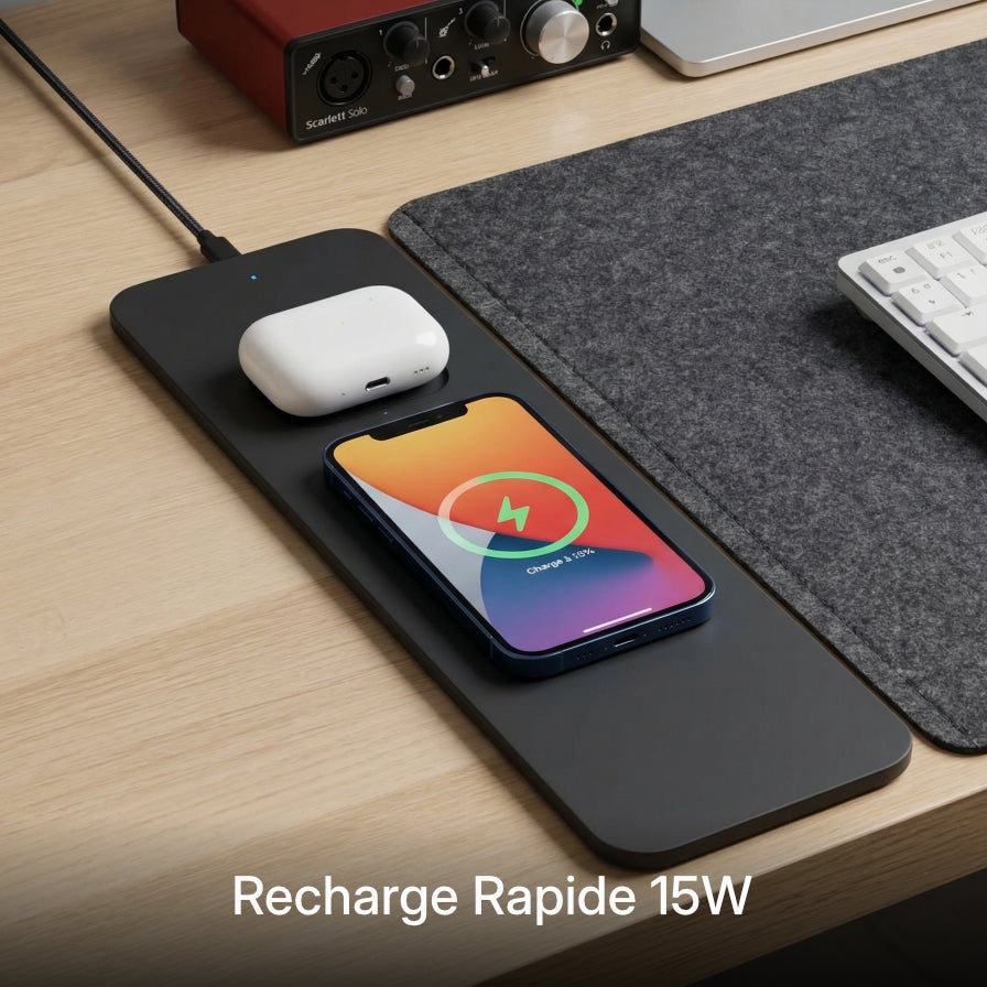 Surface de bureau premium avec recharge induction 15W intégrée. L'alliance parfaite entre ordre, confort et efficacité.